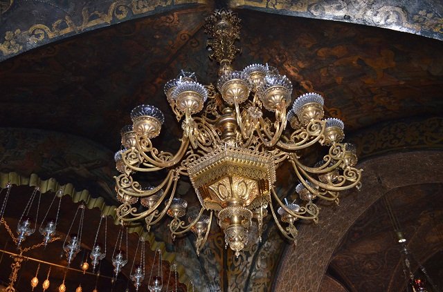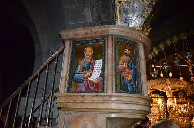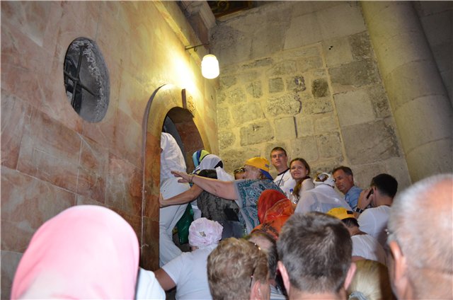 Святыня Храма Гроба Господня - Голгофа. К вершине горы, где был распят Иисус ведут мраморные ступени. Голгофский храм разделен на две части. Место, куда был врыт крест, помечено серебряным кругом, а предполагаемые места, где стояли кресты двух разбойников, казненных с Иисусом на Голгофе, обозначены двумя черными кругами. В застекленном окошке можно увидеть трещину в скале, которая образовалась при последнем вздохе Иисуса.