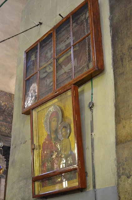 На одной из таких колонн, в Католиконе, справа от иконостаса, где изображен Иисус Христос, в 1998 году многие прихожане стали свидетелями чудесного явления - слезоточения лика Спасителя, некоторым даже посчастливилось видеть, как Иисус Христос открывает и закрывает глаза.